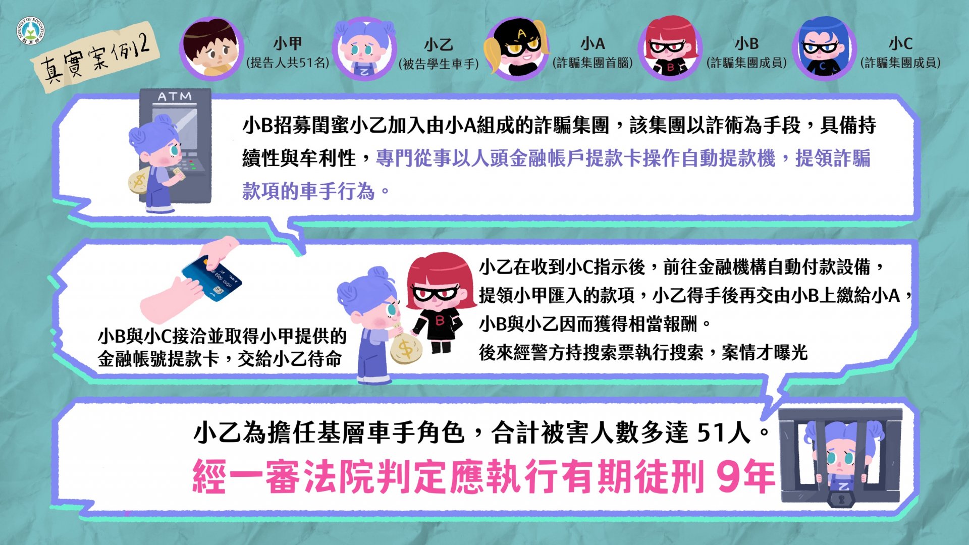 二、 | 近年來學生擔任車手涉詐欺案件數攀升,尤以 12 至 23 歲涉案最多,教育部藉由真實案例,解析學生擔任詐騙車手所可能承擔的法律責任,製作本案懶人包,避免學生遭不法分子利用,衍生後續的法律風險與責任。 |