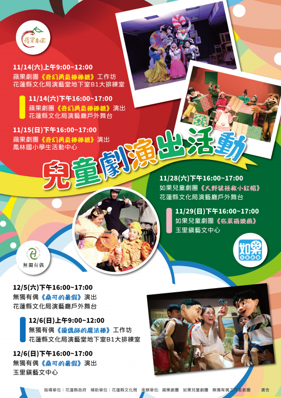 場次 1 : 109 年 11 月 28 日(週六)下午 4 時假花蓮縣文化局演藝堂戶外舞台、演出單位:如果兒童劇團《大野狼拯救小紅帽》。 |